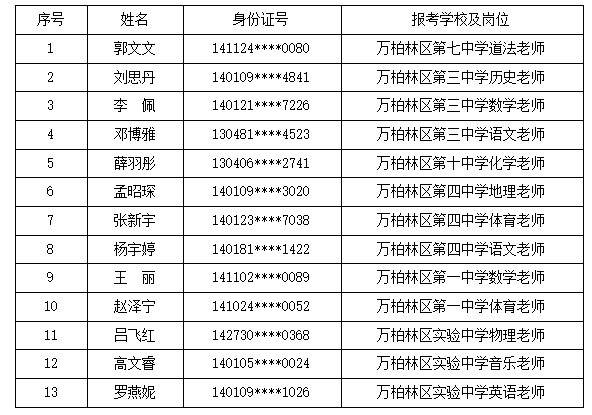 根據《2025年萬柏林區部分中學校補充招聘政府購買服務教師公告》的相關要求,山西鑫富源人力資源集團股份有限公司受托組織開展了公開招聘工作,經網上報名、資格審查、面試等招聘及考察環節,現將擬錄用人員名單予以公示。